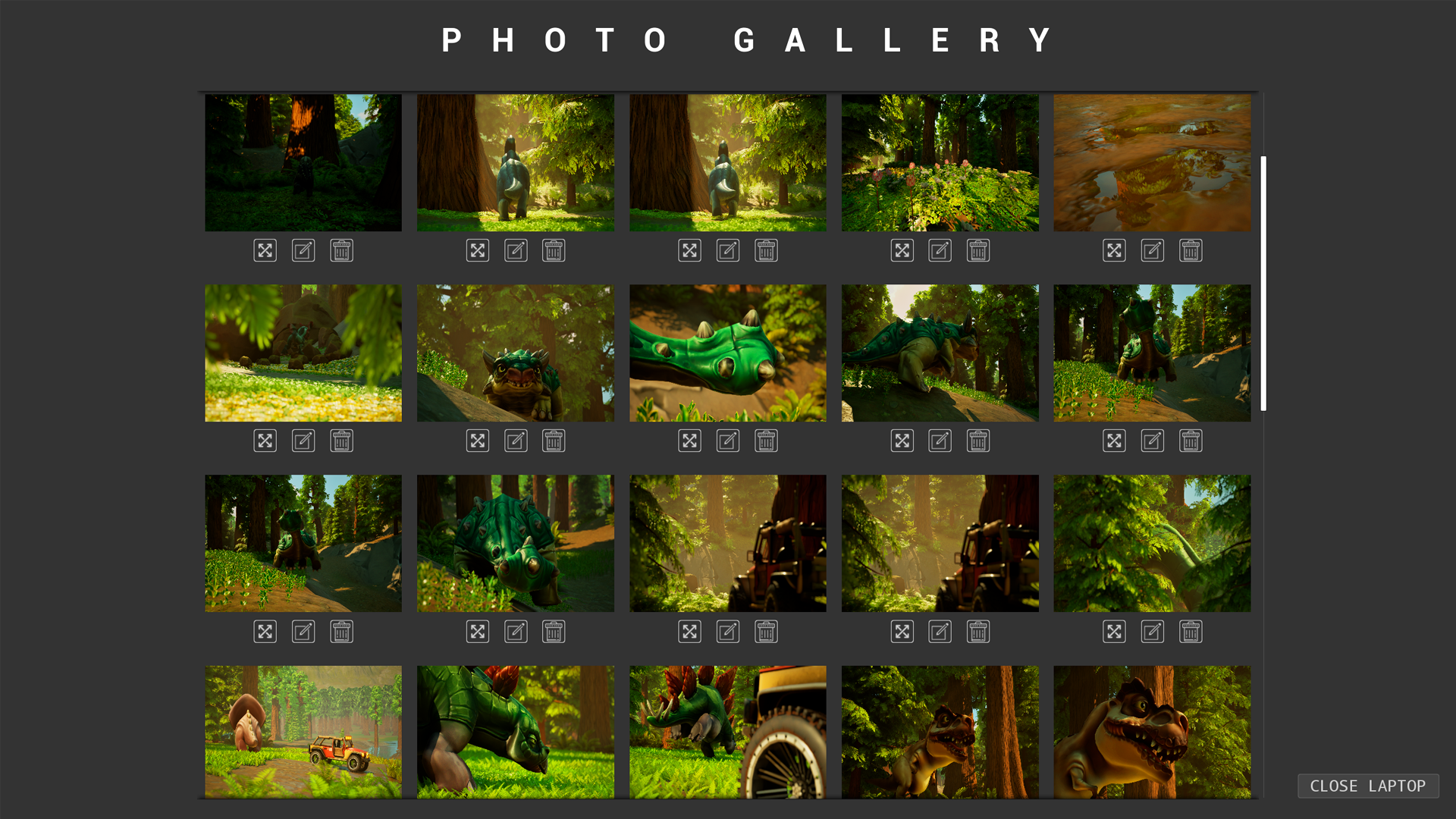 Your Photos are all saved to your in-game laptop so you can always access your Gallery and admire your work. Look back at your finest photos and remember your moments in the Prehistoric World...
